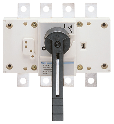 Силовые рубильники на токи 160-1600А предназначены для замыкания/размыкания цепи под нагрузкой. Поворотная ручка находится непосредственно на приборе, блокируется в состоянии ВЫКЛ замком.