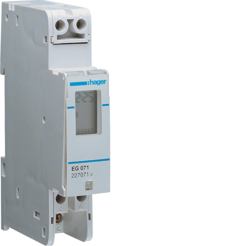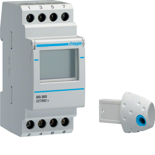 В квартирах, частных домах, на предприятиях, в офисах и других производственных помещениях все чаще применяются таймеры для управления освещением, отоплением, вентиляцией, ролл-ставнями, и отдельными электрическими устройствами в зависимости от времени. Для этой цели концерн Hager предлагает цифровые и аналоговые таймеры. Особенно выделяются цифровые таймеры cronotec благодаря простому управлению через программный ключ. Этот ключ служит элементом памяти для программы коммутации. С его помощью программа может быть быстро введена в несколько таймеров Hager.Технические характеристики: